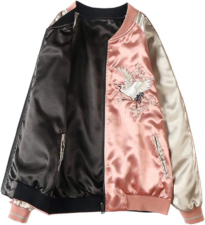 Amazon Habille レディース ピンク ブラック 鶴 桜 無地 スカジャン 横須賀 リブブルゾン ラグラン ストリートスタイル おまけ付 ピンク コート ジャケット 通販