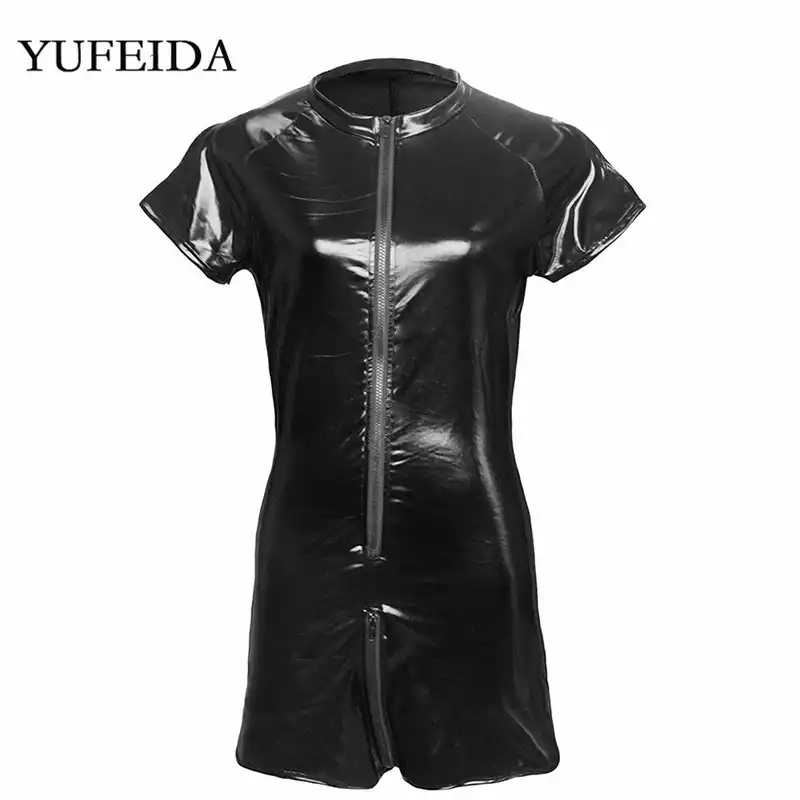 セクシーなメンズ下着ジャンプスーツpuレザージッパーロンパース肌着ワンピースレスリングシングレットレオタードショートオーバーオールダンスウェア Aliexpress